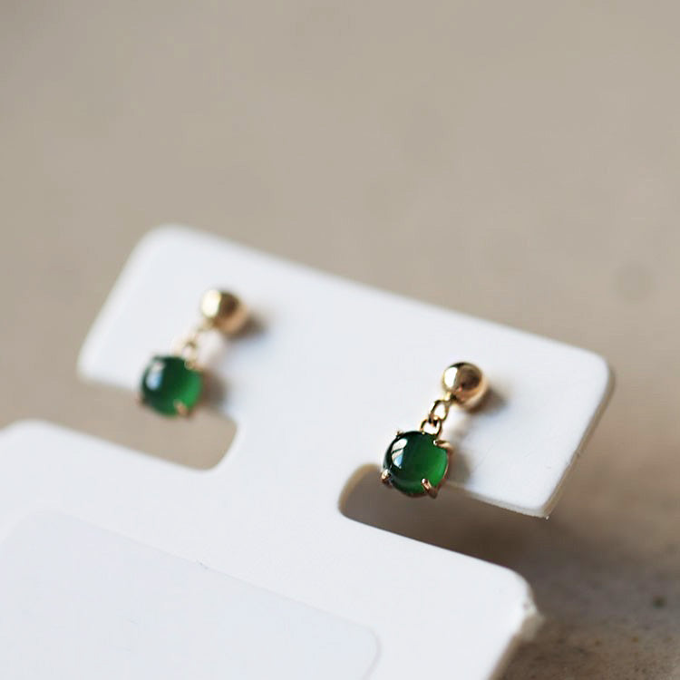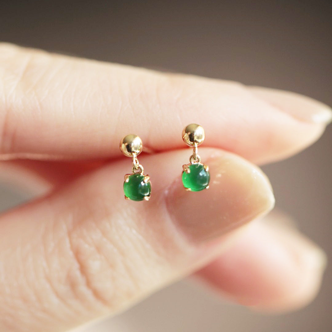 A pair of 925 sterling silver tiny jade earrings with a classic gold finish, highlighting the vibrant green gemstones.