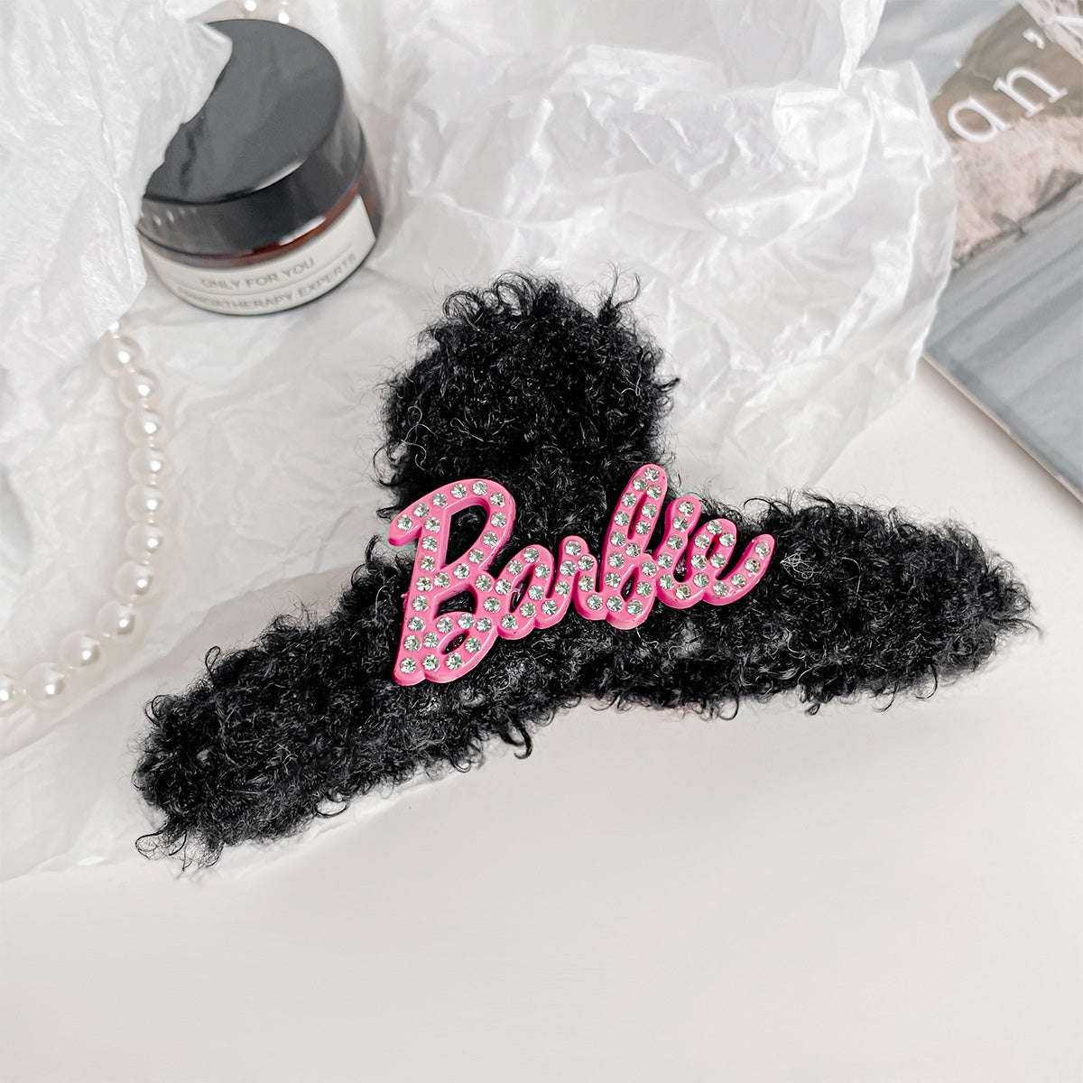 Close-up of a pink plush Barbie-themed hair claw clip with rhinestone details.