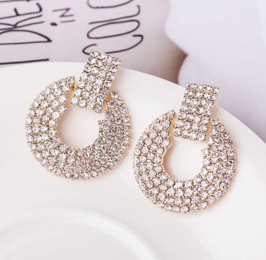 Alternative view of the statement earrings, showcasing a gold teardrop design with clear rhinestones.