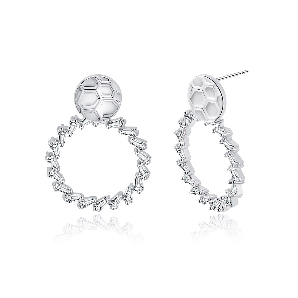 Discover our elegant wholesale drop earrings, meticulously crafted from rhodium-plated brass for a brilliant, lasting shine. These earrings feature a chic hammered design, symbolizing unity and timeless style. Each piece is adorned with a sparkling ring of cubic zirconia, adding a touch of glamour perfect for any occasion. With dimensions of 33*20 mm, they are the ideal size for a statement look that transitions seamlessly from desk to date night. As a leading supplier, JR Fashion Accessories offers this exquisite piece from our Cubic Zirconia collection, ensuring top quality for your fashion accessory needs.