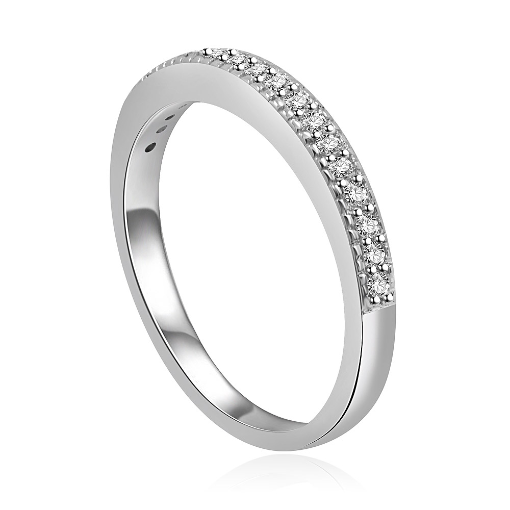 Angled shot of the silver eternity ring, emphasizing the brilliance of the diamond-encrusted top portion.