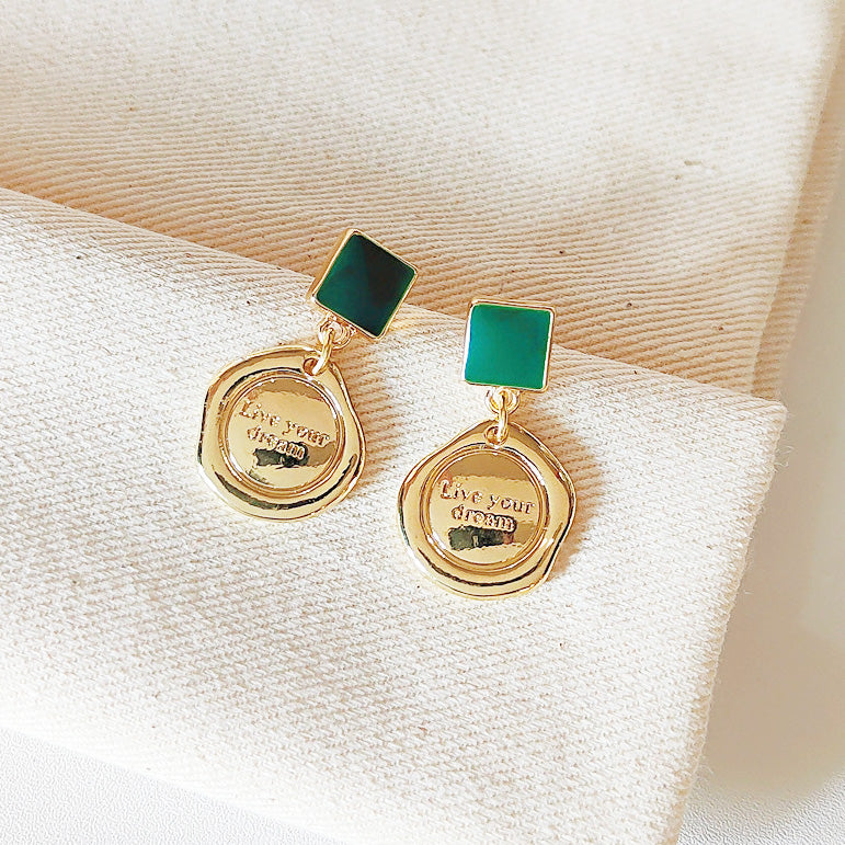 Elevate your accessory offerings with these beautifully crafted gold-plated dangle earrings. Each piece features a striking green enamel square stone, perfectly complemented by a dangling circular charm. The charm is delicately engraved with the motivational phrase "Live your dream," adding a unique and personal touch that resonates with customers.