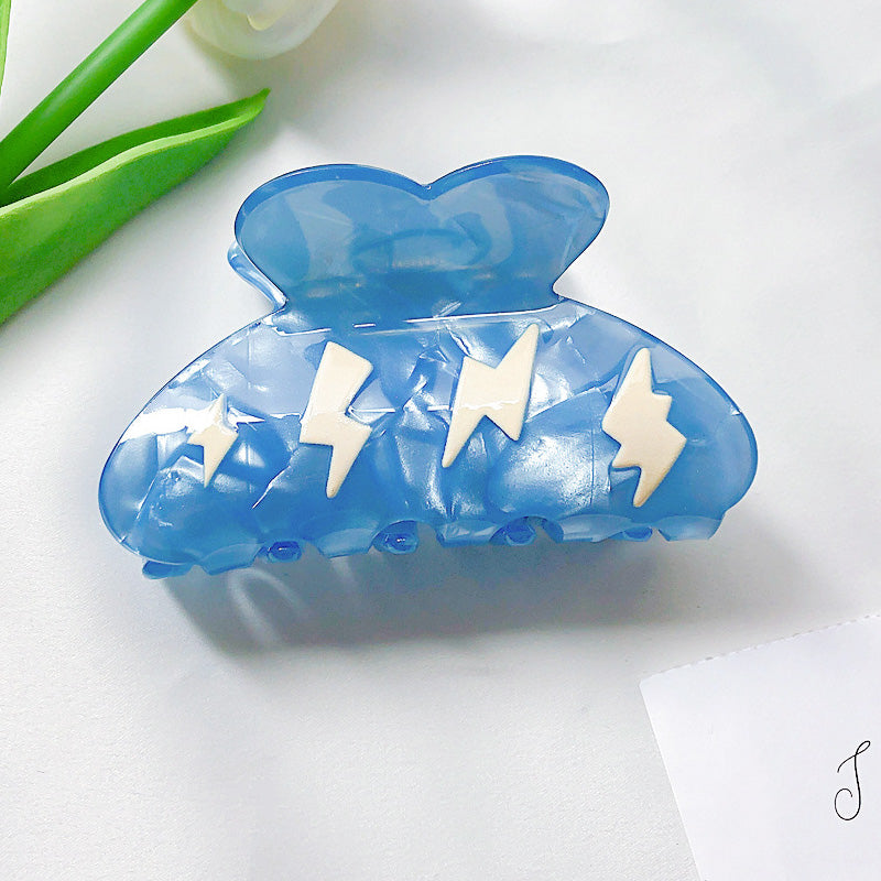 Close-up of a blue acetate hair clip featuring a white lightning bolt design.