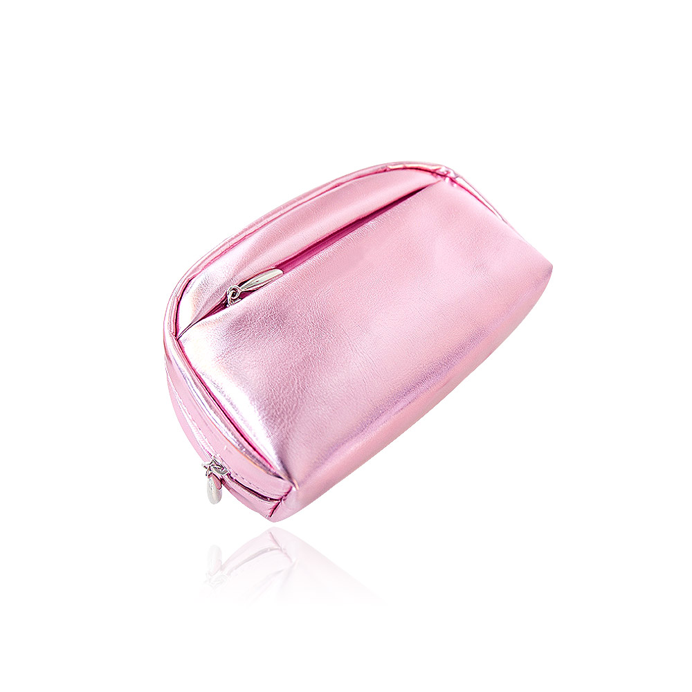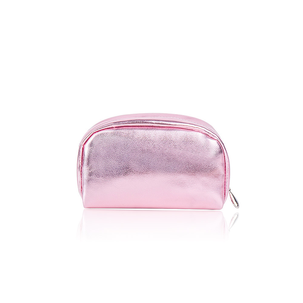 - Side profile of the pink metallic cosmetic bag highlighting its shape.