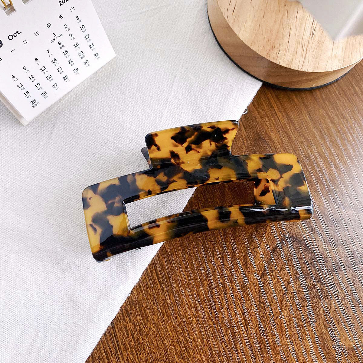 A close-up of a classic tortoiseshell square acetate hair clip.