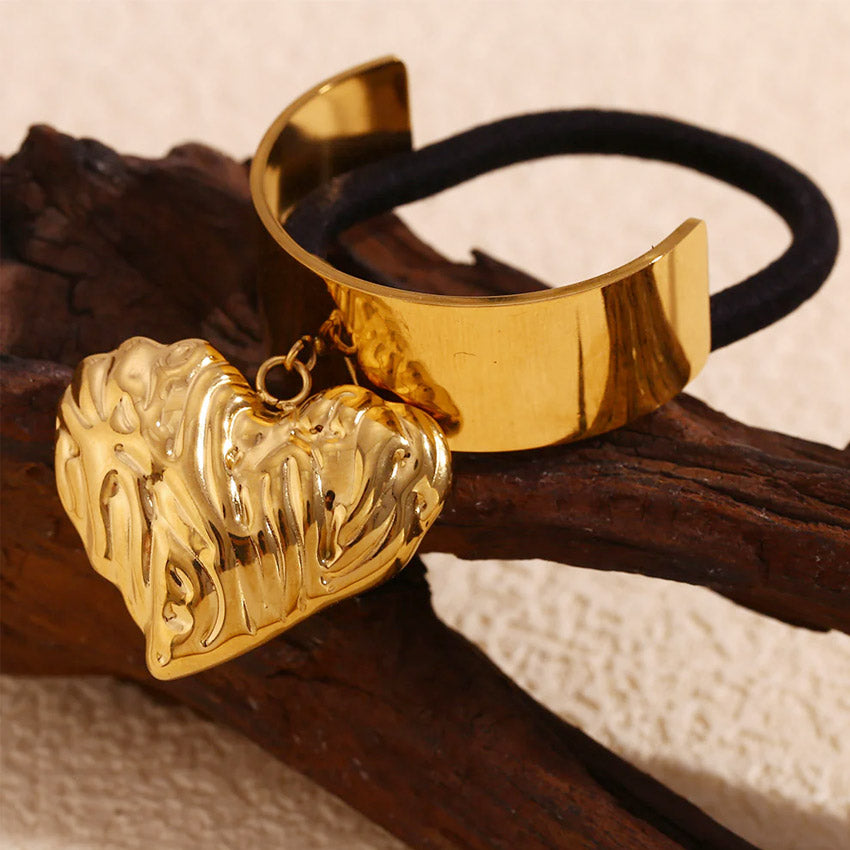 The Stainless Steel Cuff Wrap Heart Charm Ponytail Hair Ties for Women combine elegance with functionality. Featuring a metallic cuff design paired with a heart-shaped charm and a strong black elastic hair tie, this accessory elevates any hairstyle with its minimalist yet stylish design. The heart charm has an irregular surface texture, adding a unique touch. Made from stainless steel, it is durable, rust-resistant, and hypoallergenic. Available in gold and silver finishes, it is perfect for securing ponytails or buns while complementing your look.