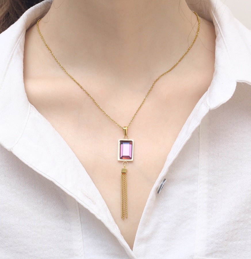 Introducing our Tassel Rectangle Glass Jewelry Set, a perfect blend of contemporary design and timeless elegance. This set, featuring a captivating necklace and matching stud earrings, is crafted from durable stainless steel and is available in either a brilliant rhodium or a luxurious gold finish. The centerpiece of each piece is a striking rectangular purple glass stone, complemented by delicate tassel details that add movement and flair.