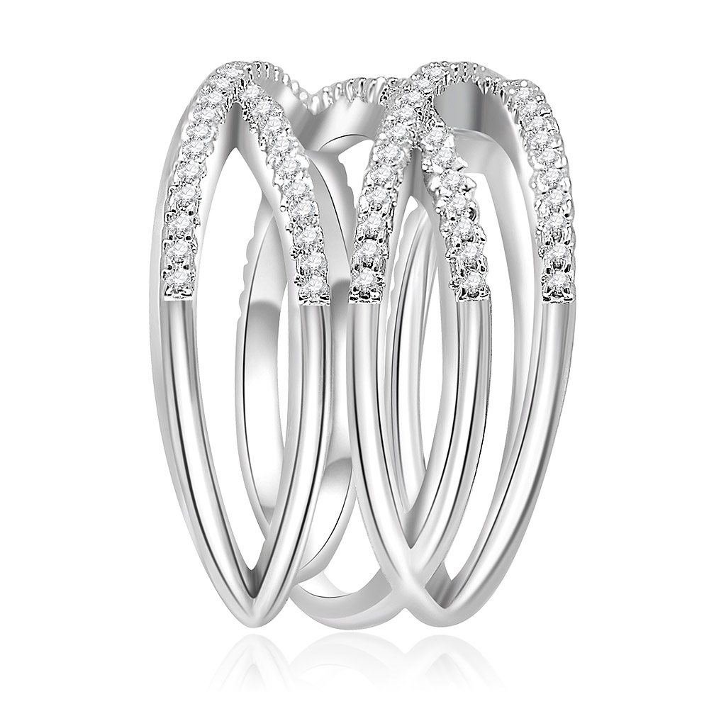 - Detailed view of the Wide Crossover X Bliss Ring, showing the interconnected bands and pave-set cubic zirconia.