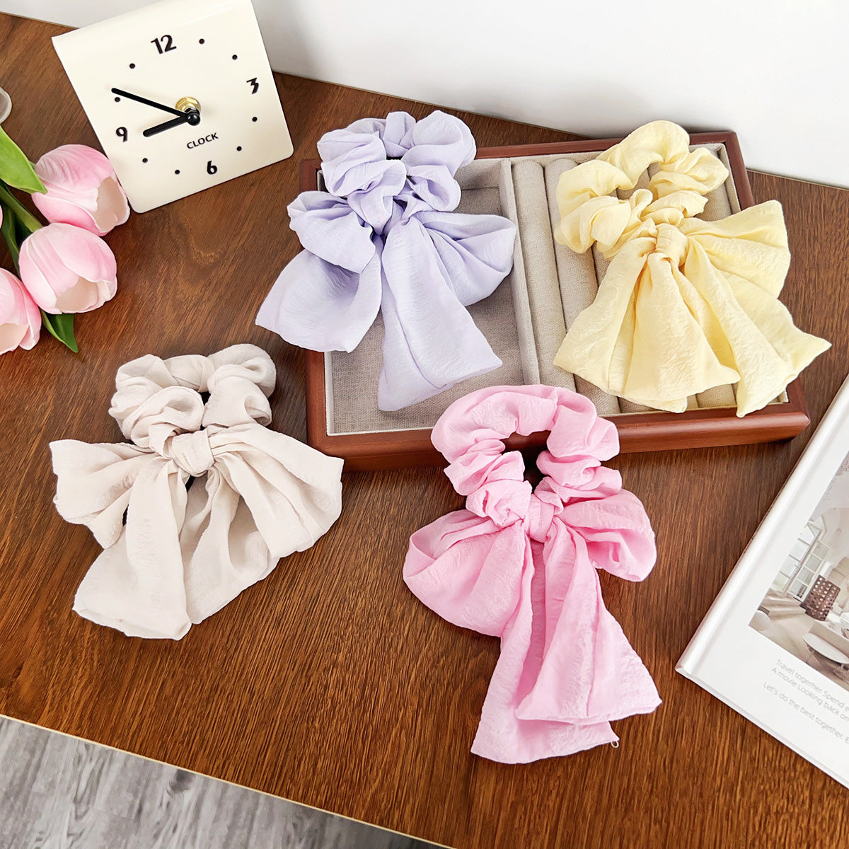 Each set includes a beautiful assortment of colors, including soft purple, sunny yellow, delicate pink, and classic white. The charming ribbon-knot design adds a touch of elegance, making them more than just a simple hair tie. Whether you're heading to the office, the gym, or a casual outing, these scrunchies are the ideal accessory.