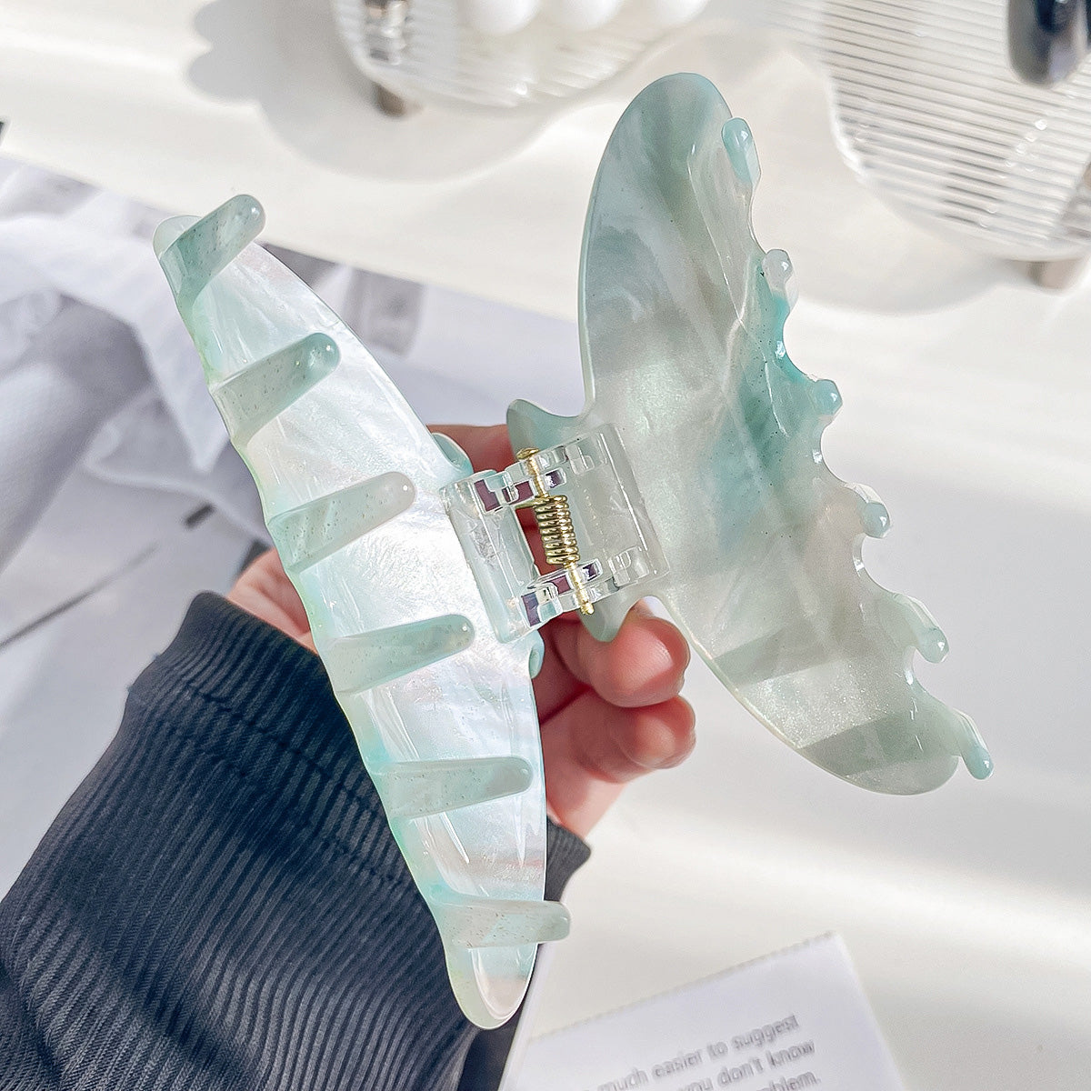Close-up of a light blue-green butterfly-shaped acetate hair clip with gold details.