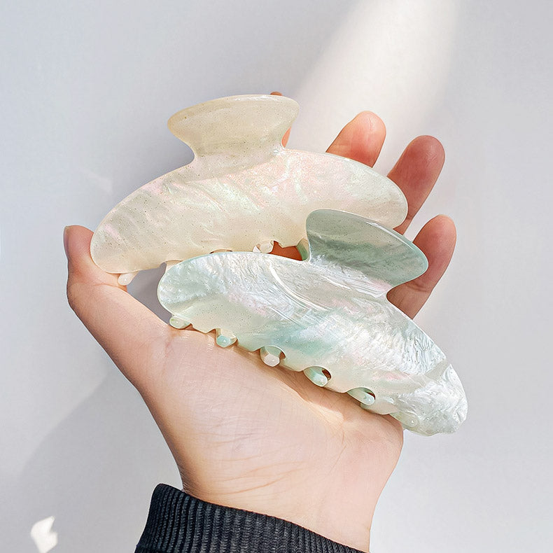 Two pearlescent acetate claw hair clips showcasing their elegant finish.