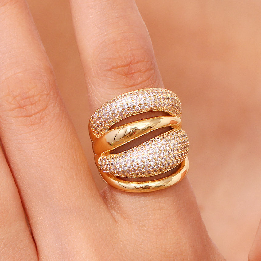 Detailed view of the 18K gold plated CZ chunky rings, showing both plain and paved layers.