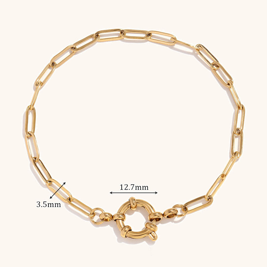 Gold chain bracelet with link width and diameter dimensions shown.
