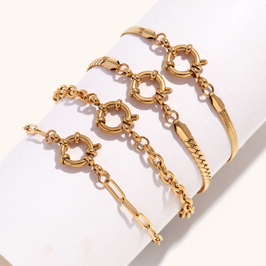 Detailed view of the various gold chain bracelets, highlighting their intricate designs and circular connectors.
