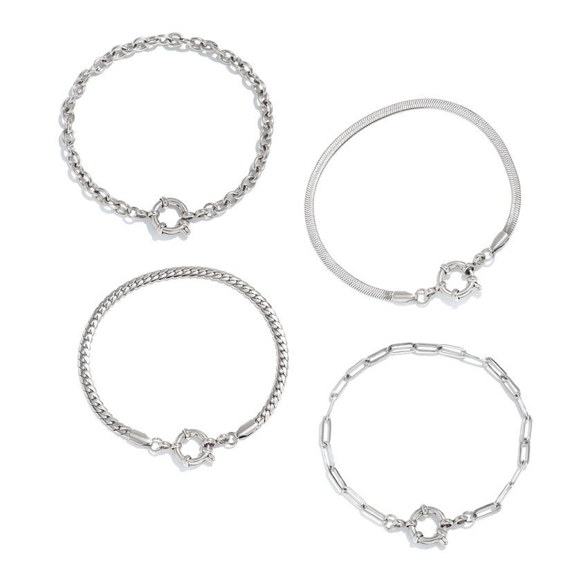 Set of stylish silver-plated stainless steel chain bracelets displayed on a white surface.