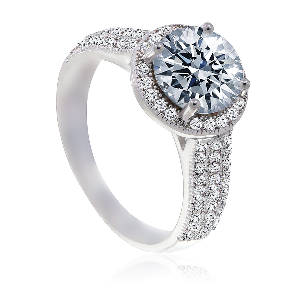 - Side view of the Worldly Ring, highlighting the halo setting and the diamond-encrusted band.
