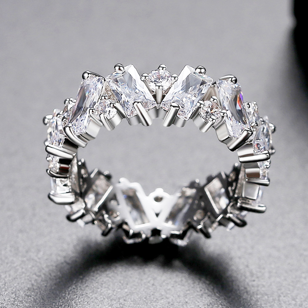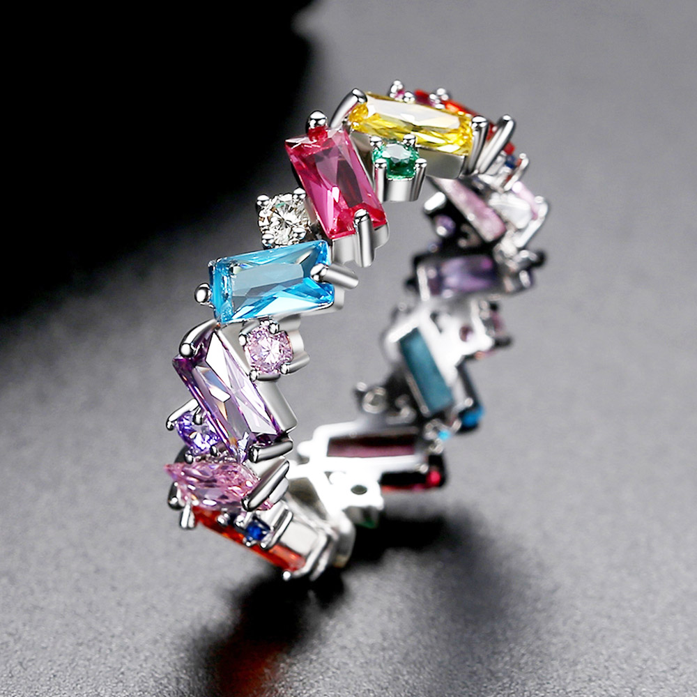 The ZigZag Baguette Ring in rhodium plating with vibrant rainbow cubic zirconia.