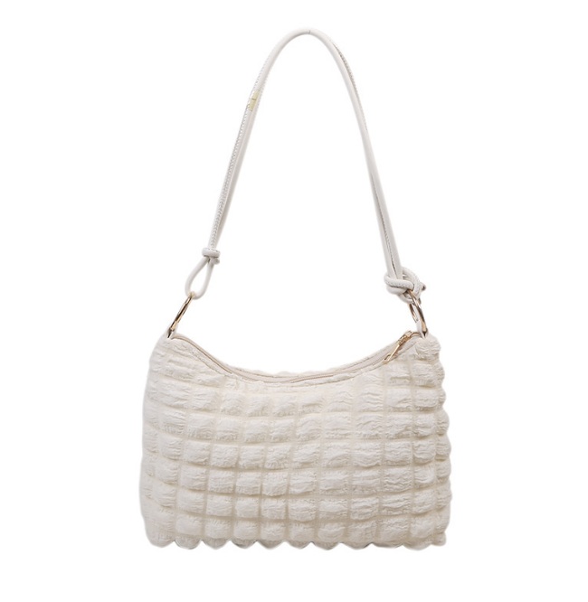 - Stylish white quilted handbag with gold chain strap.