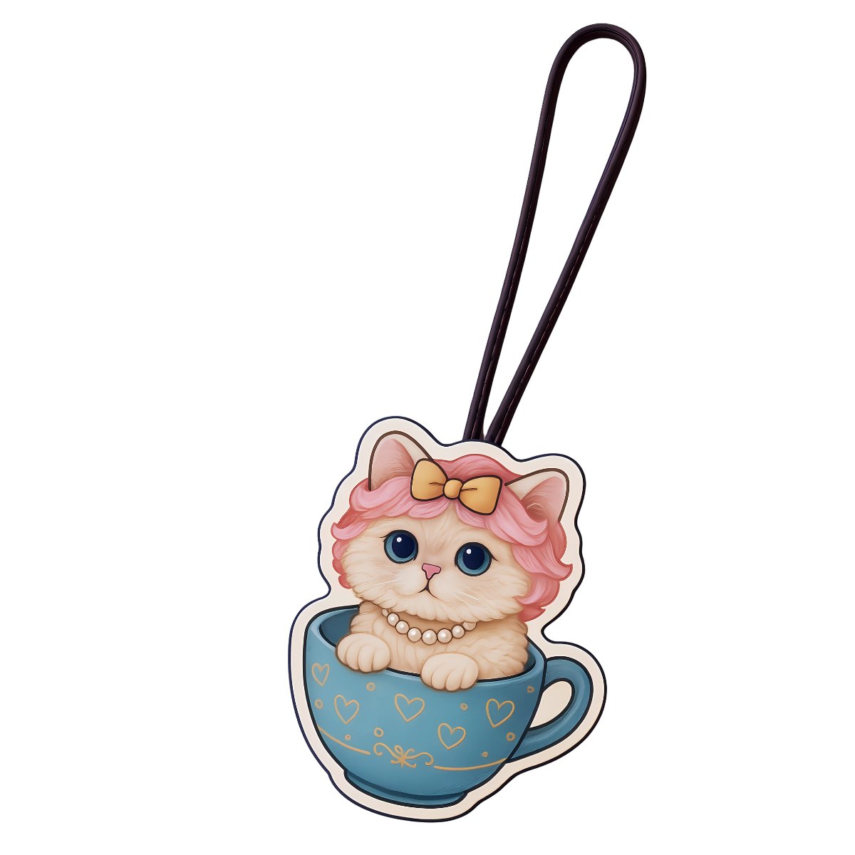 - Whimsical cartoon cat keychain sitting in a blue teacup, an example of custom UV printed accessories.