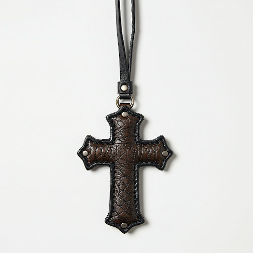 - Detailed leather cross pendant with silver rivets, showcasing religious accessory customization.