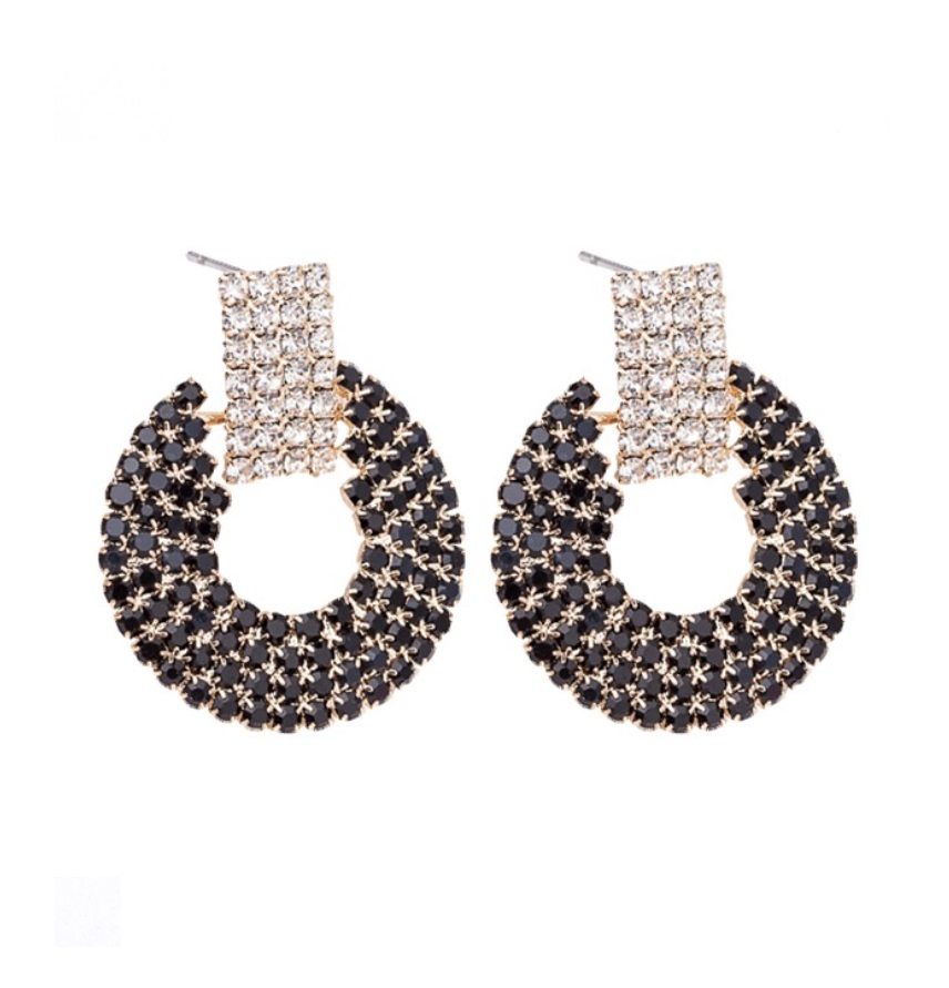 - Elegant gold-toned dangle earrings with black and clear gemstones in a geometric design.