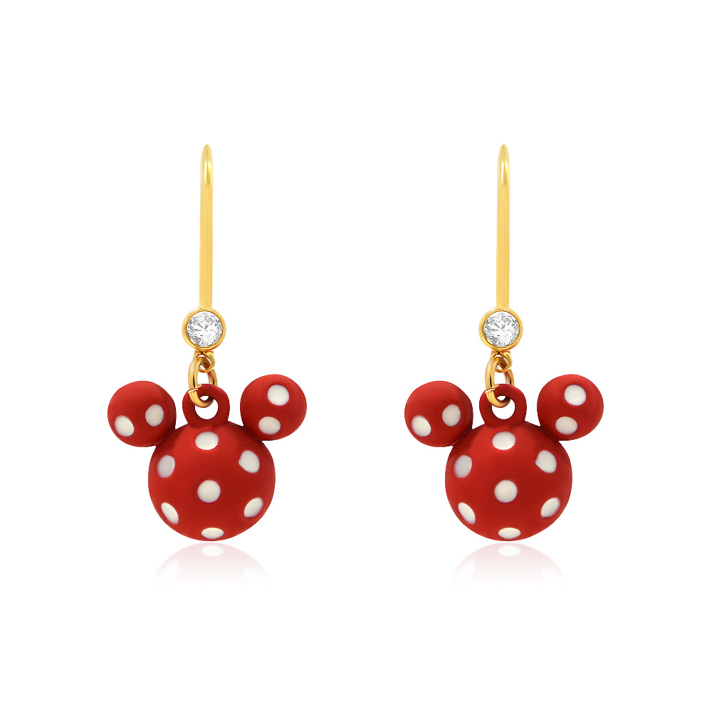 - Whimsical red Mickey Mouse themed drop earrings with white polka dots and gold hooks.