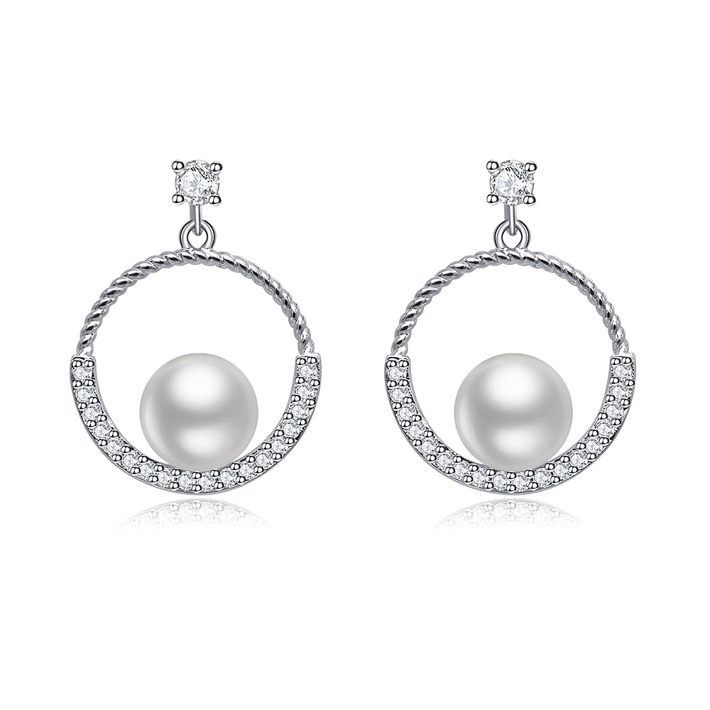 - Classic silver drop earrings featuring a lustrous white pearl surrounded by a halo of sparkling diamonds.