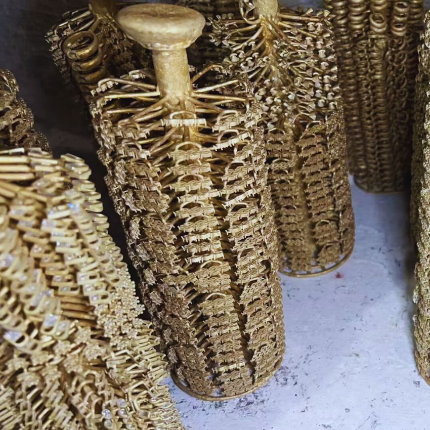 The wax tree is placed in a flask and filled with investment plaster. Once hardened, the wax is melted out, and molten metal is poured into the cavity, creating the raw jewelry pieces.