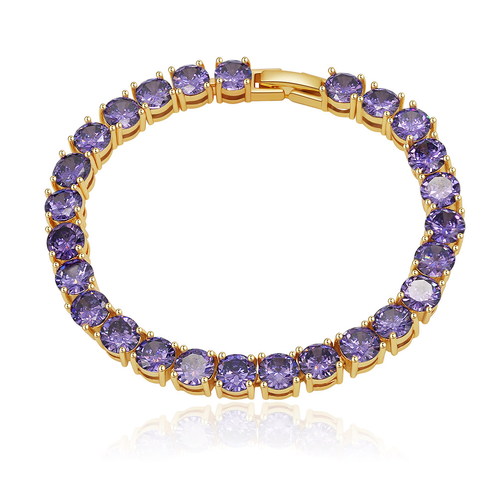 Elegant gold tennis bracelet with sparkling purple cubic zirconia.