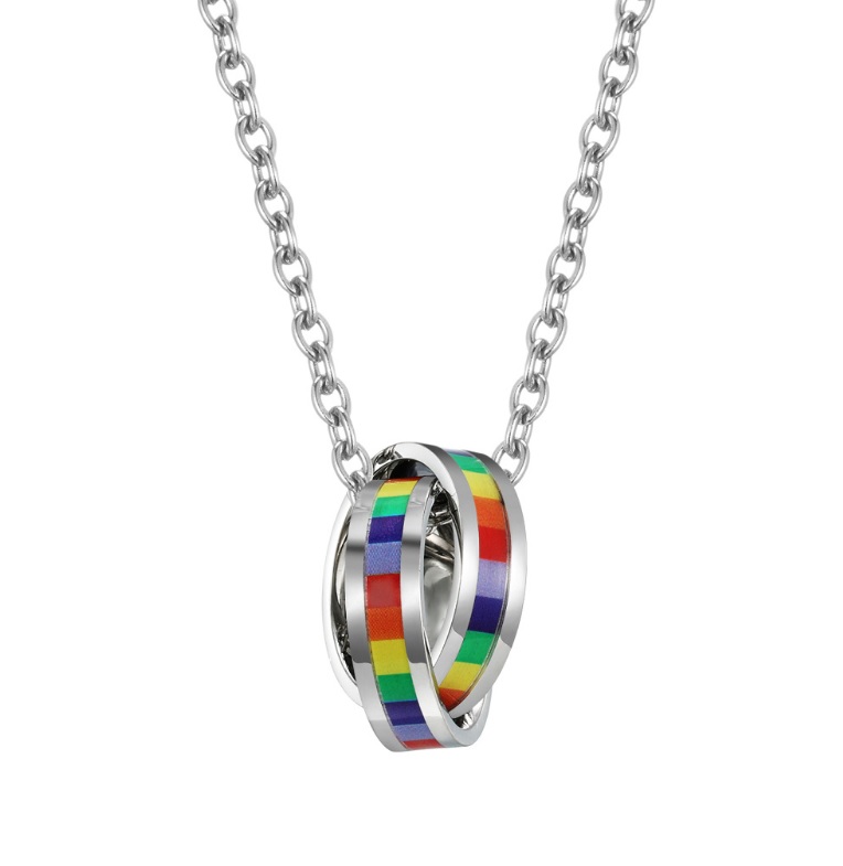 Stainless steel necklace with interlocking rings pendant featuring a rainbow enamel design.