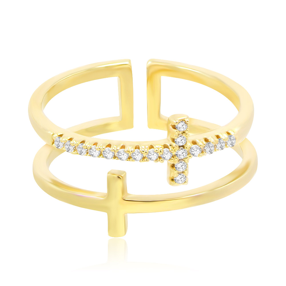 Stylish gold ring featuring a cross design with diamond accents.