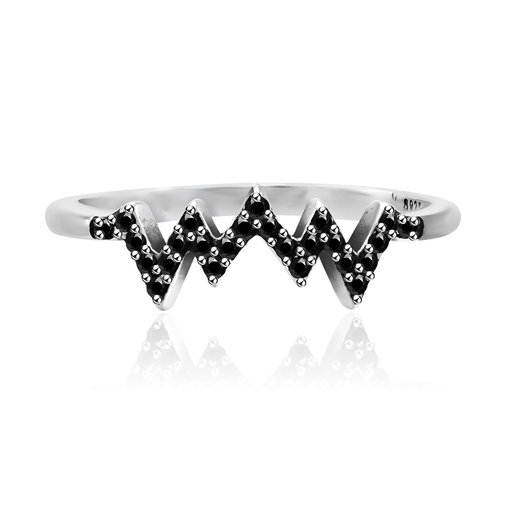 Modern sterling silver zigzag ring set with striking black gemstones.